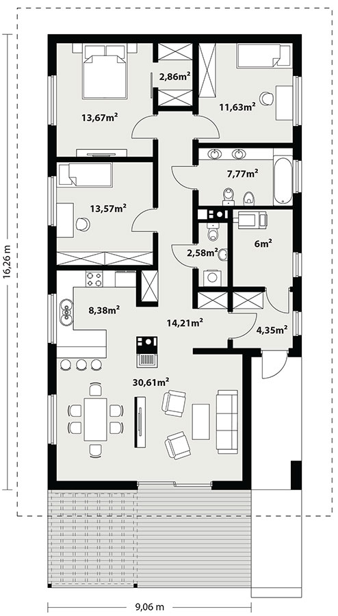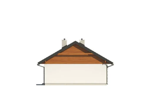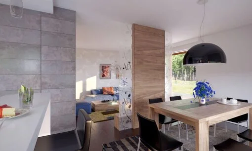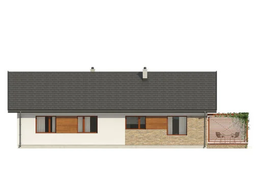 Wnętrze domu obejmuje przestronny salon połączony z aneksem kuchennym, trzy sypialnie, łazienkę, a także funkcjonalne pomieszczenia gospodarcze, takie jak wiatrołap i kotłownia. Dzięki prostej, ponadczasowej bryle oraz obecności tarasu, dom doskonale komponuje się zarówno z nowoczesną, jak i bardziej naturalną architekturą otoczenia.