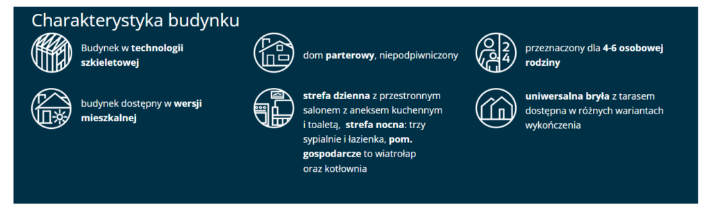 Dom w technologii szkieletowej dostępny w wersji mieszkalnej przeznaczony dla 4-6 osobowej rodziny.