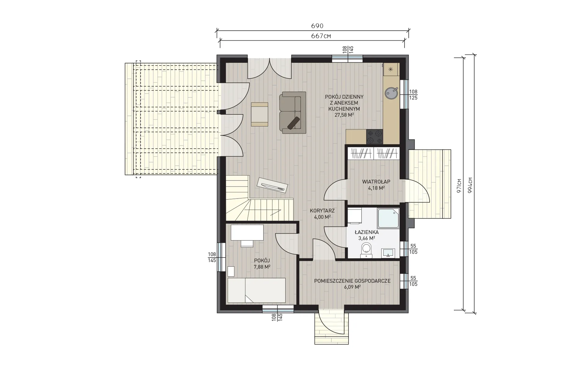 Dom drewniany Zephira to piękny budynek wykonany w technologii szkieletowej. Wersja mieszkalna z dużym salonem, 3 sypialniami, 2 łazienkami i pomieszczeniem gospodarczym to idealne miejsce do życia dla rodzin ceniących naturalne rozwiązania domów drewnianych.