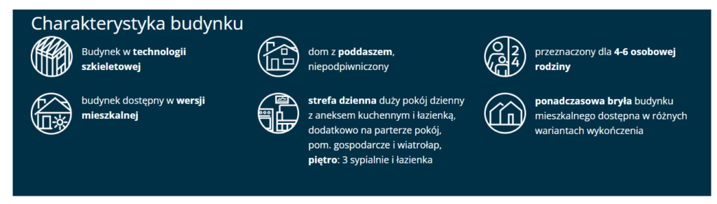 Konstrukcja oparta na technologii szkieletowej nie tylko zapewnia stabilność i trwałość, ale też przekłada się na wysoką izolację termiczną, co pomaga obniżyć koszty ogrzewania. Dom wykonany jest z wysokiej jakości materiałów, co gwarantuje długowieczność i bezpieczeństwo użytkowania.