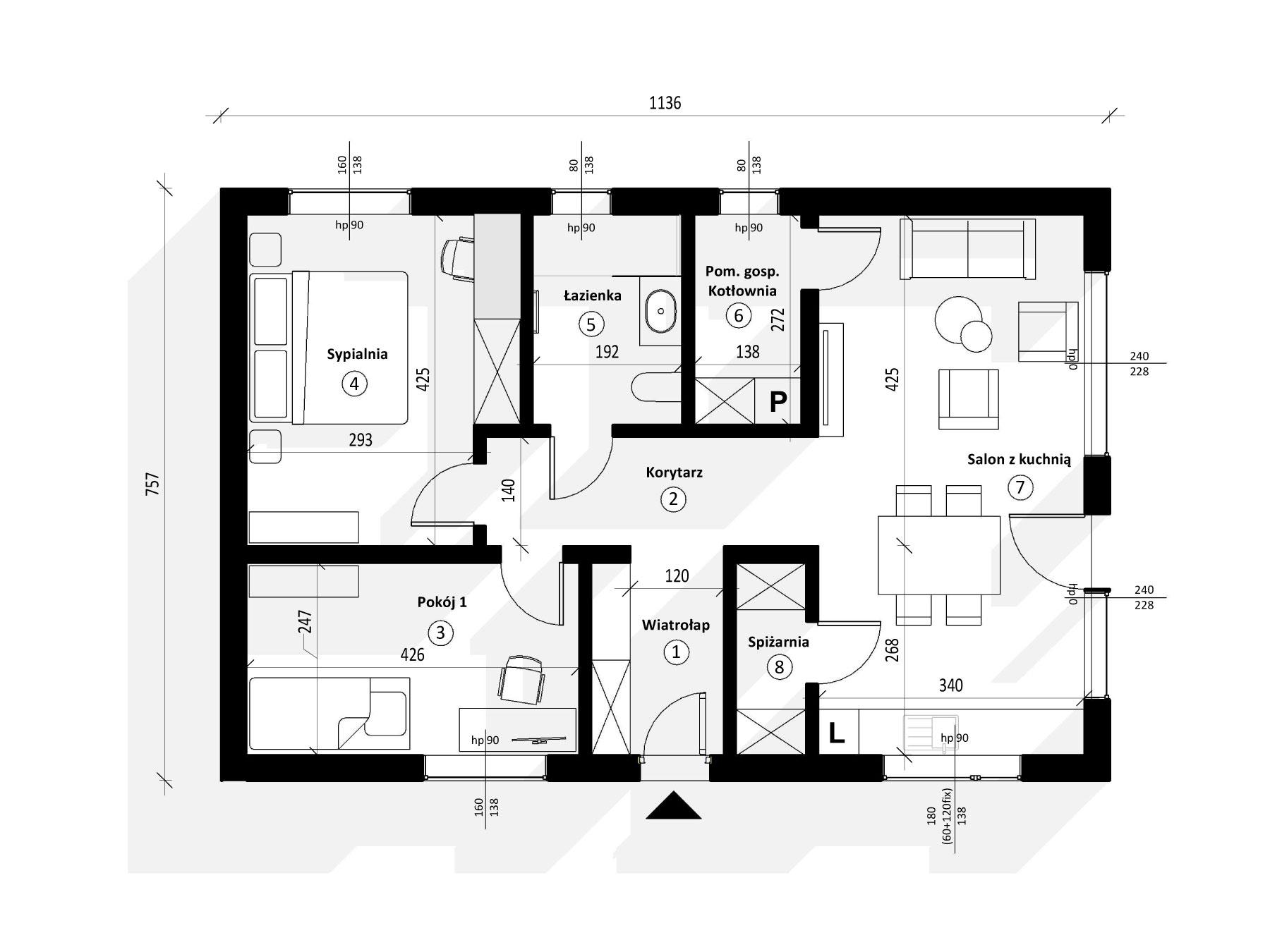 Wymiary budynku: 13,52 m x 7,57 m2