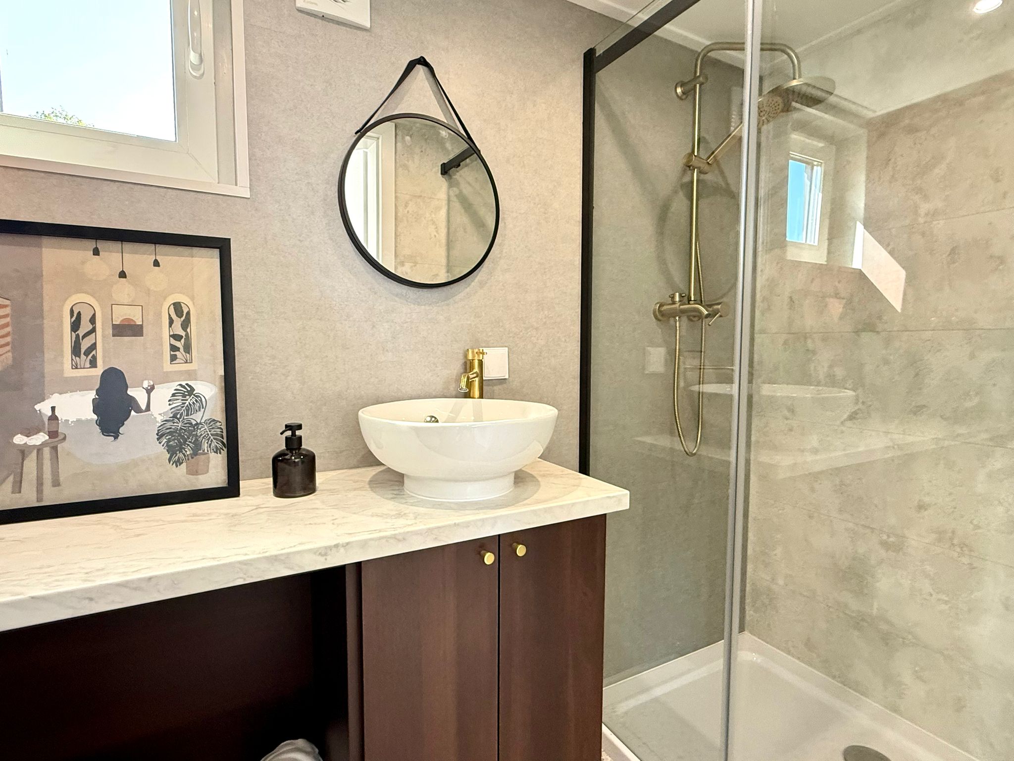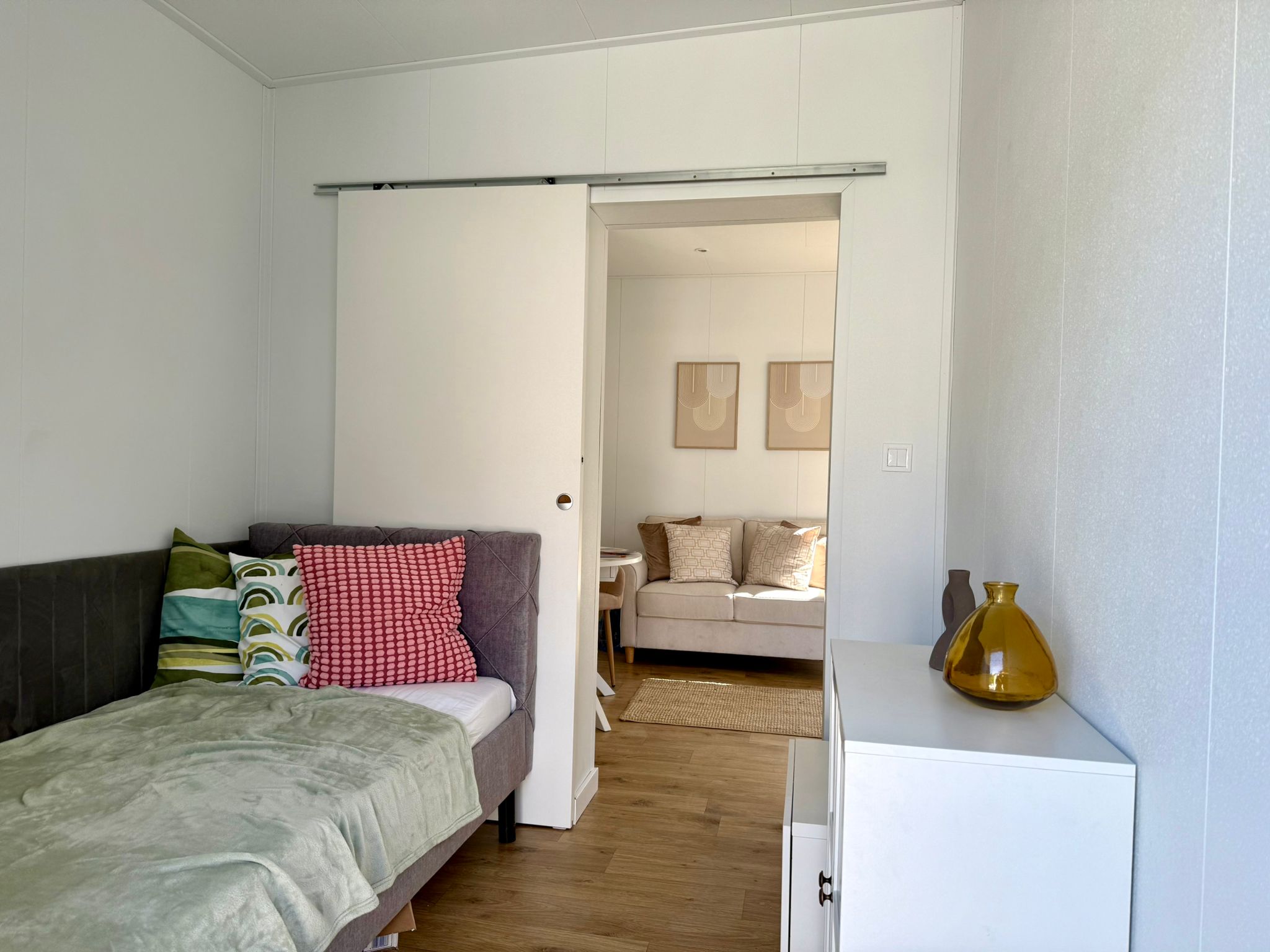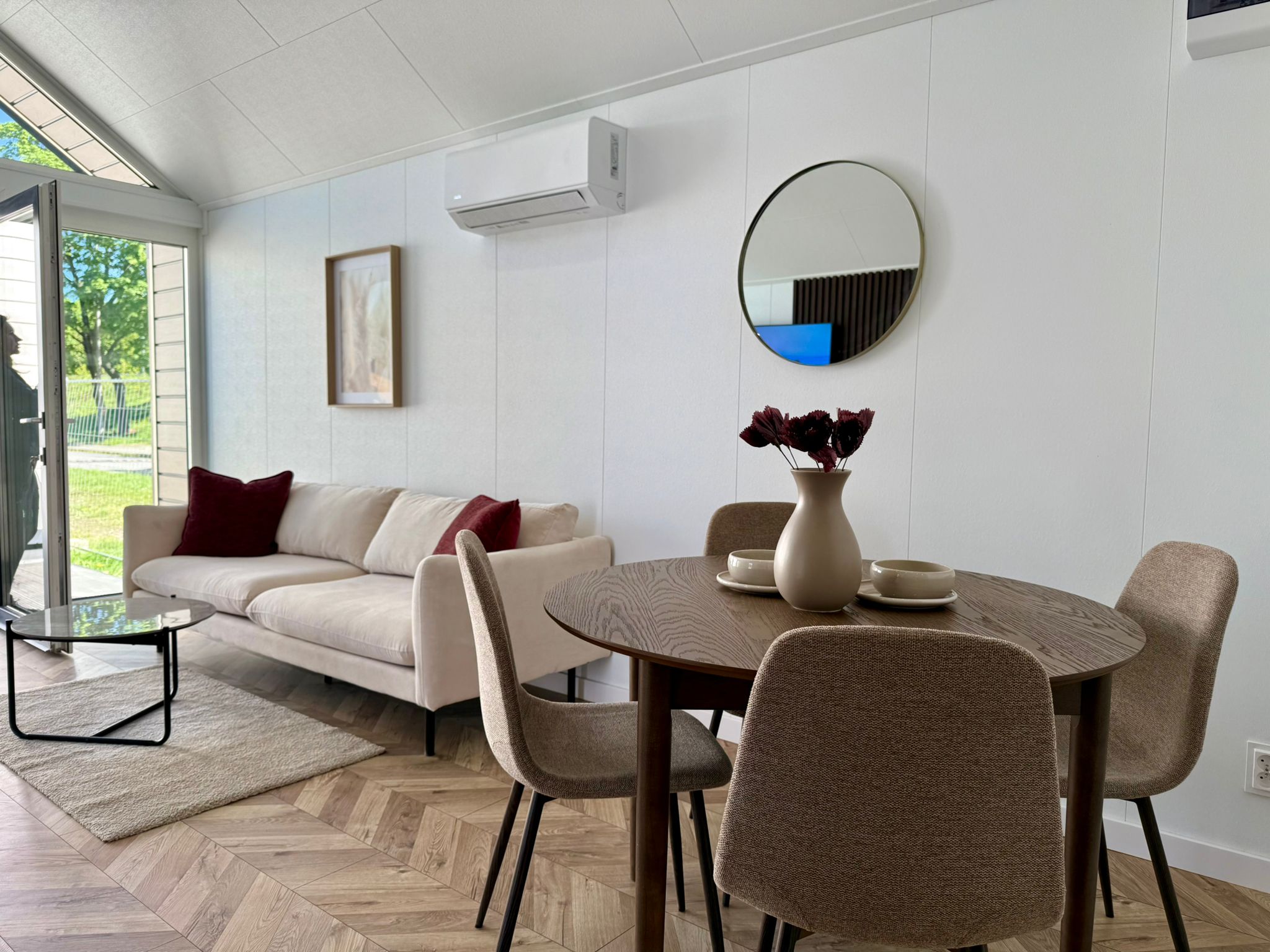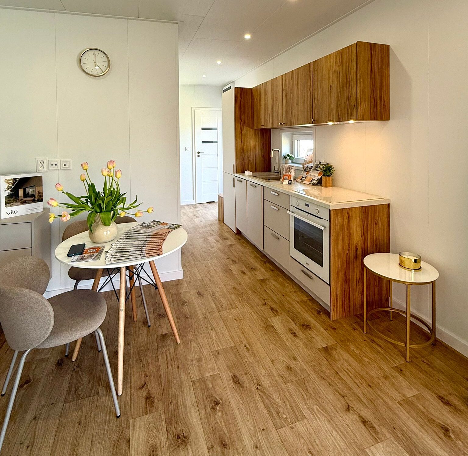 W standardzie pełne instalacje (elektryczna, wodno-kanalizacyjna, wentylacyjna), bojler elektryczny 10 l, wyposażona łazienka i kuchnia. Oświetlenie LED wewnętrzne i zewnętrzne.