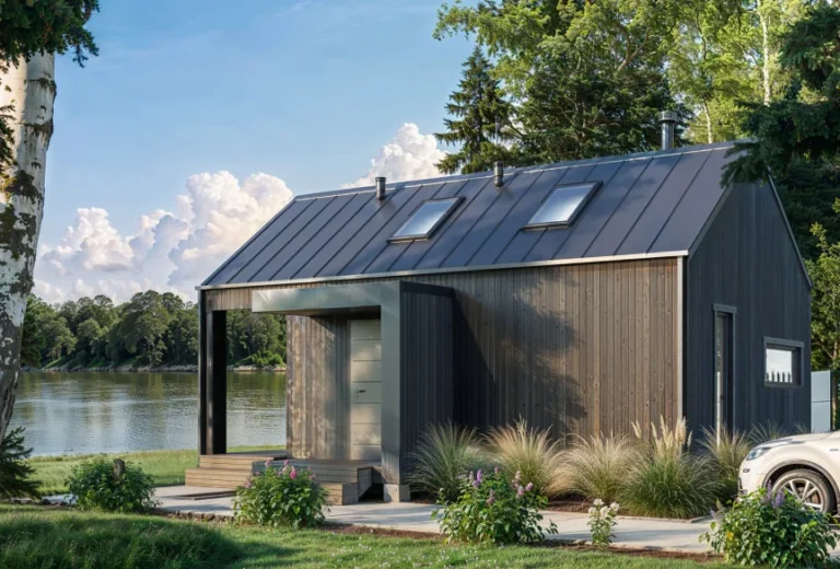 Dach: Warstwowy z izolacją wełną mineralną (30 cm), pokryty blachą na rąbek lub blachodachówką.