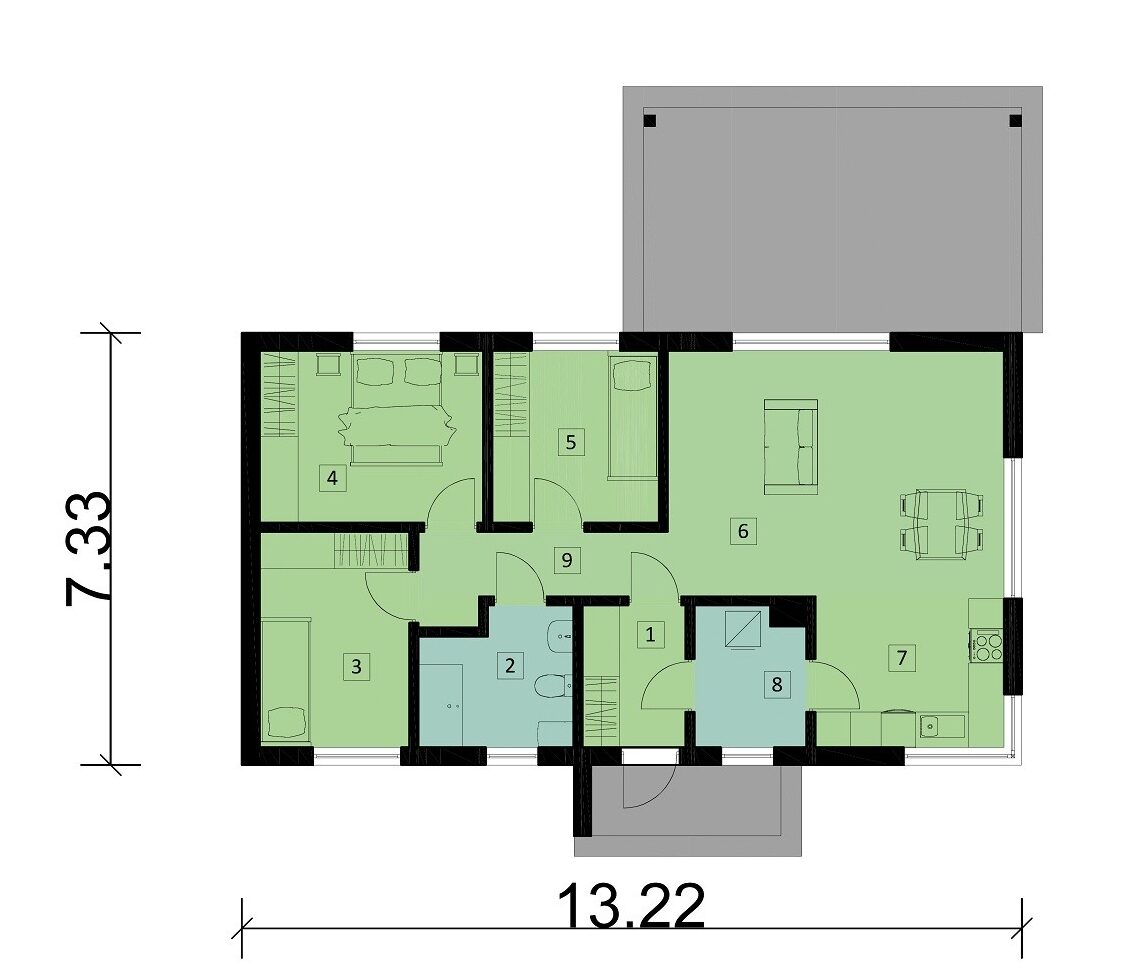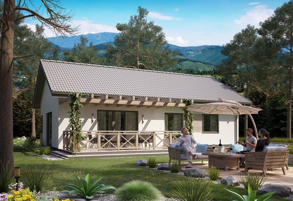 Dom drewniany z poddaszem w technologii szkieletowej dostępny w wersji mieszkalnej przeznaczony dla 2-4 osobowej rodziny.