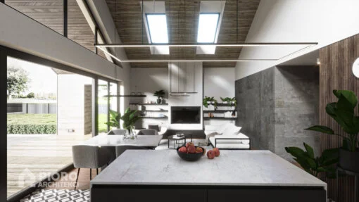 Projekt wyróżnia się nietuzinkową architekturą i nowoczesnymi rozwiązaniami, które przyciągają uwagę i nadają wnętrzom unikalny charakter. Dwie luksusowe łazienki zapewniają wygodę na co dzień, a każdy element wystroju został zaplanowany z myślą o estetyce i funkcjonalności.