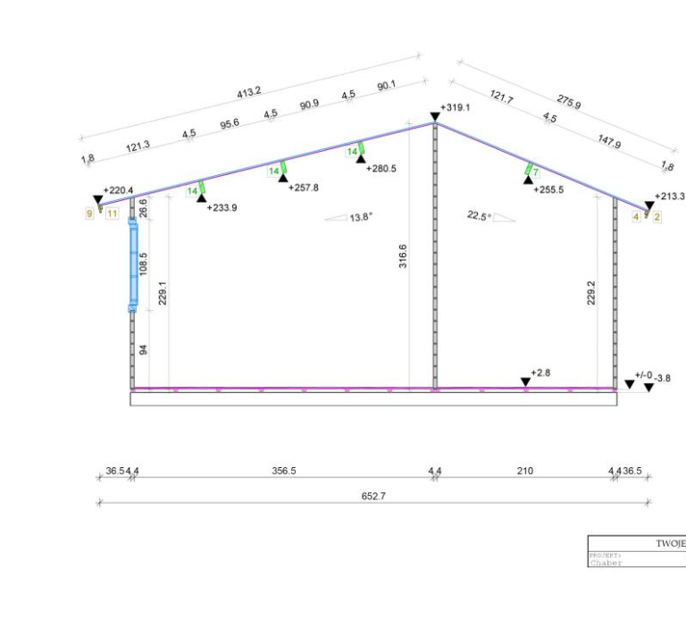 Nachylenie dachu – 13,8 / 22,5°