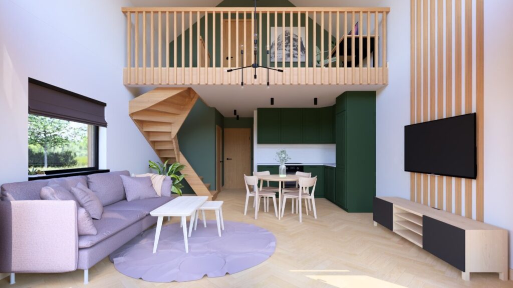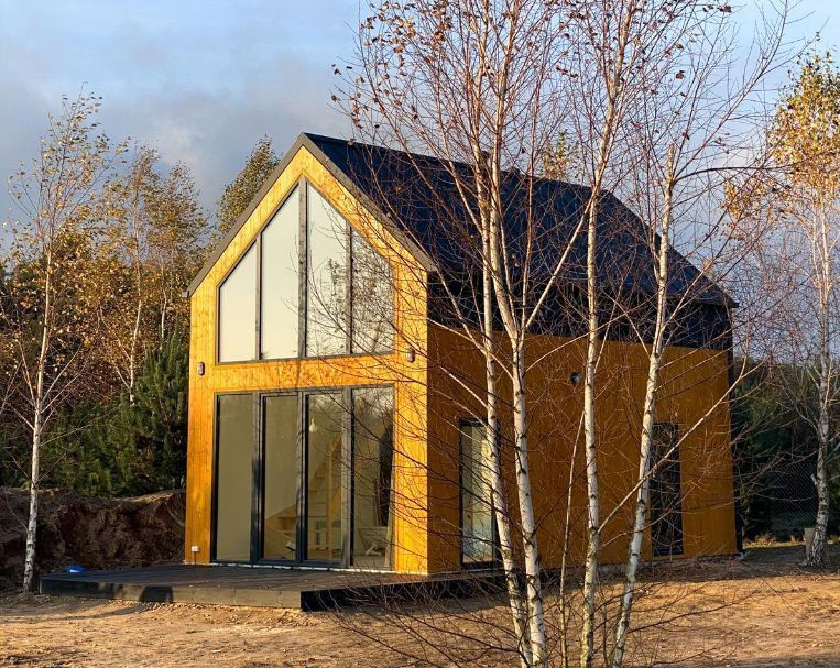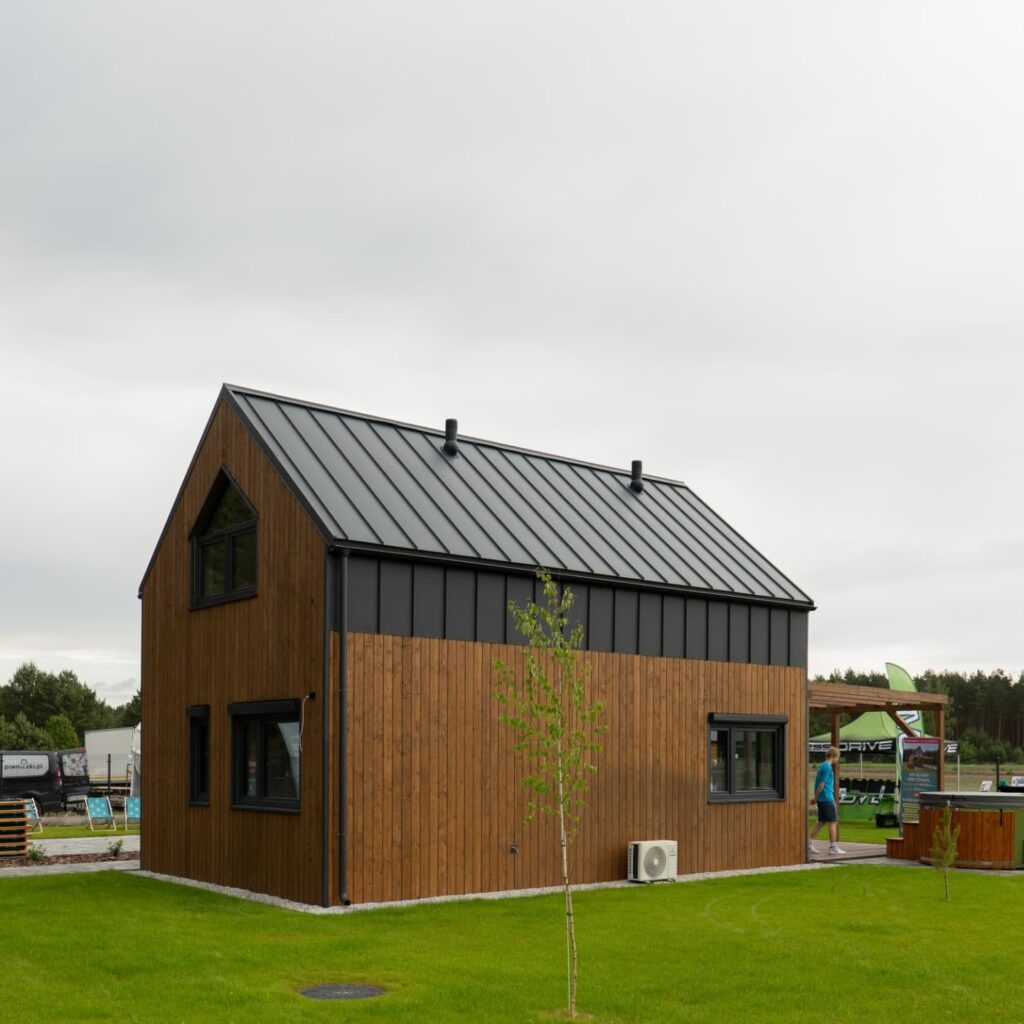 KORA – Kompaktowy, całoroczny dom o powierzchni 65 m², który zachwyca nowoczesną architekturą i dużymi przeszkleniami. Przemyślany układ z dwoma sypialniami, dwoma łazienkami i antresolą zapewnia komfort nawet dla 8 osób.