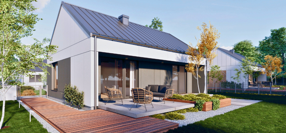 • Elewacja w standardzie tynk silikonowy lub deska elewacyjna (do wyboru).