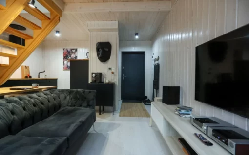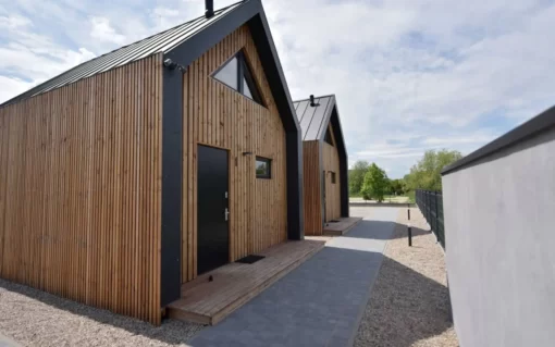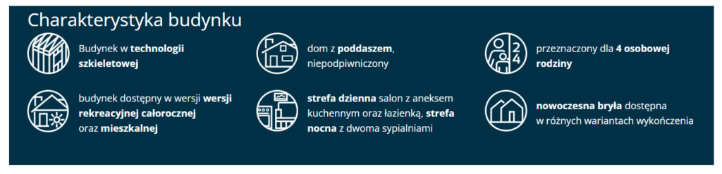 Dom drewniany szkieletowy wykonany w konstrukcji szkieletu drewnianego w całości ocieplony wełną mineralną grubości 15 cm (λ 0,033) wykończony drewnem lub płytą Fermacell (do spoinowania). Jest to wersja domu drewnianego, który pozwala na użytkowanie całym rokiem. Wydzielone pomieszczenia za pomocą szkieletu 7 cm wypełnionego wełną mineralną 5 cm. Dom wyposażony w stolarkę okienną trzyszybową PCV oraz w stolarkę drzwiową (drzwi wejściowe antywłamaniowe, drzwi wewnętrzne drewniane). Na stropie deska podłogowa świerkowa z możliwością wygłuszenia. Dach pokryty blachodachówką wraz z obróbkami blacharskimi i orynnowaniem. Możliwość postawienia komina systemowego z obróbką nad dachem.