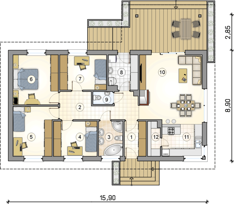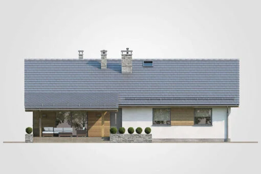 Amadea to nowoczesny dom parterowy o powierzchni użytkowej 117,30 m², stworzony z myślą o rodzinach liczących od 2 do 4 osób. Projekt ten łączy przemyślaną funkcjonalność z estetyką współczesnej architektury.