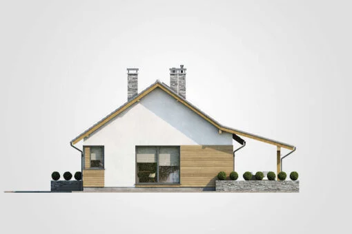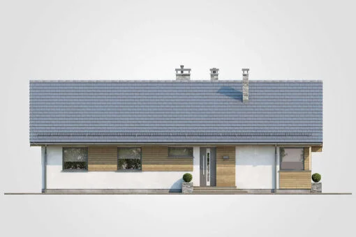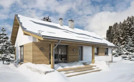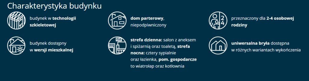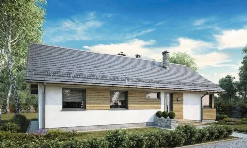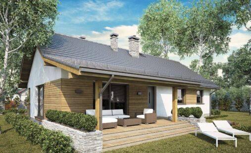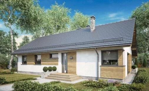 Dom drewniany parterowy w technologii szkieletowej dostępny w wersji mieszkalnej przeznaczony dla 2-4 osobowej rodziny.