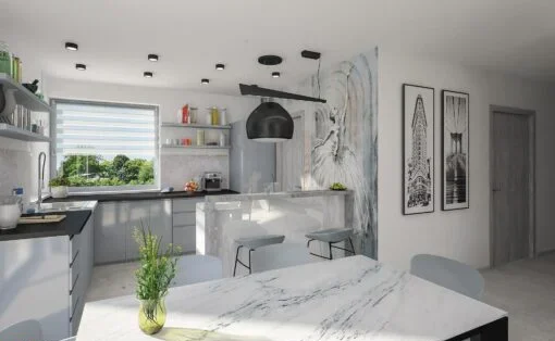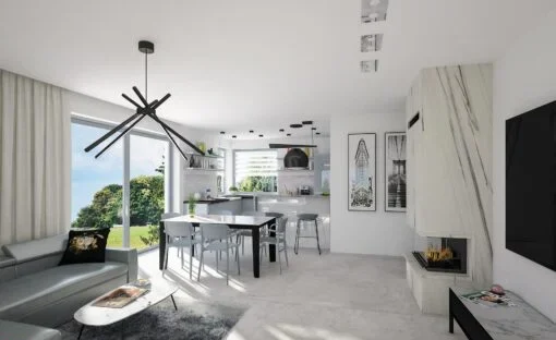 Zaprojektowany w technologii szkieletowej, dom zapewnia energooszczędność, solidność i szybki czas realizacji. Przestronna część dzienna obejmuje salon, aneks kuchenny i spiżarnię, tworząc otwarte i przyjazne centrum domowego życia.
